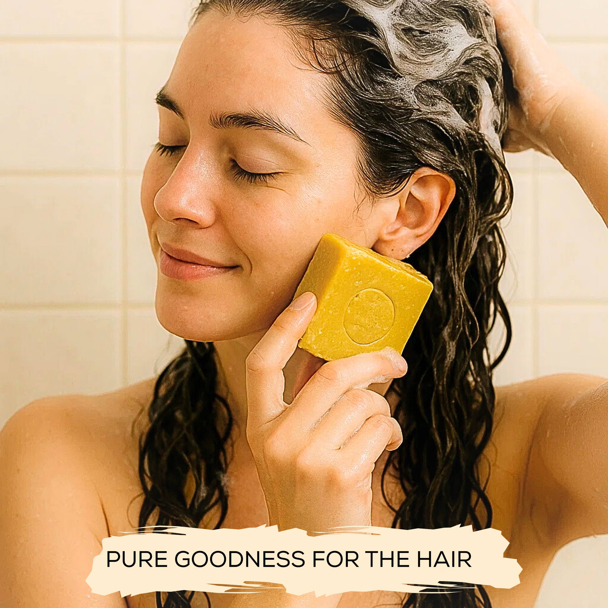 This soap is gentle enough for daily cleansing on your face, body, and scalp. Use it as a solid shampoo bar to calm flaky skin and add natural shine to hair.