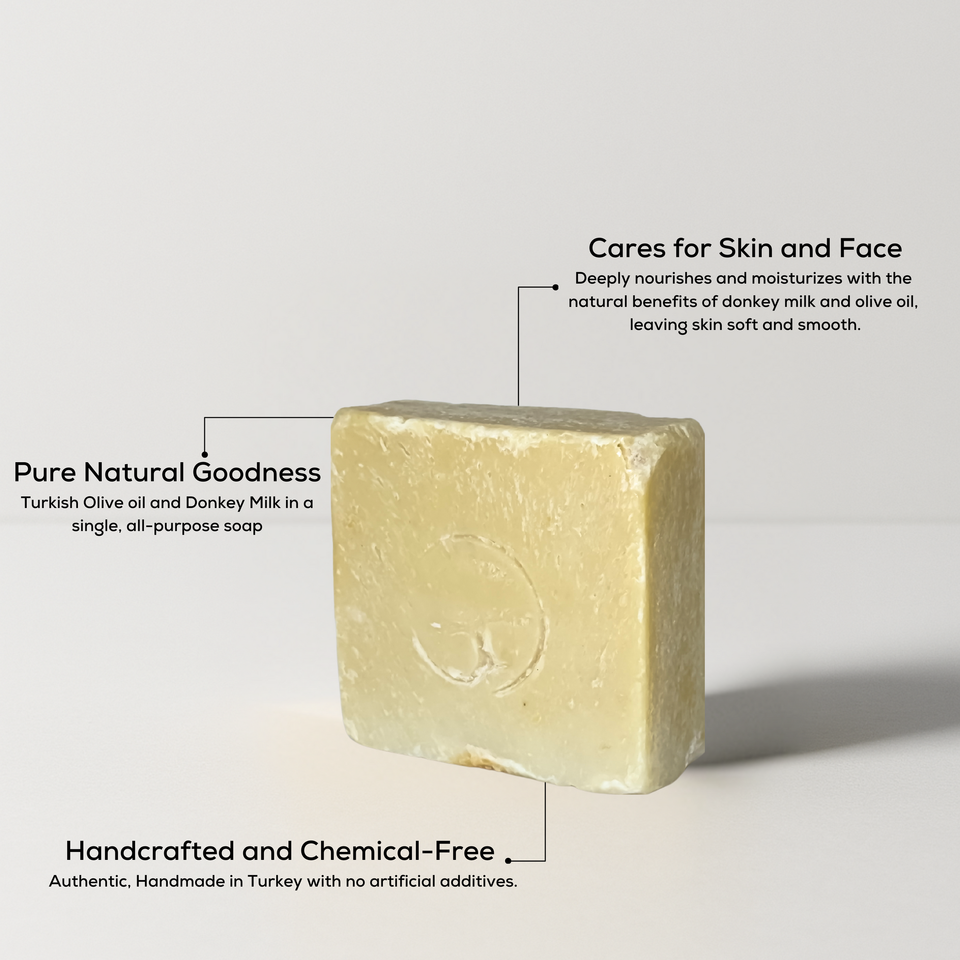 Donkeys produce only about 1 litre of milk per day, making donkey milk one of the most exclusive ingredients in skincare. Each bar is handcrafted in Turkey with care, offering you a piece of true luxury.